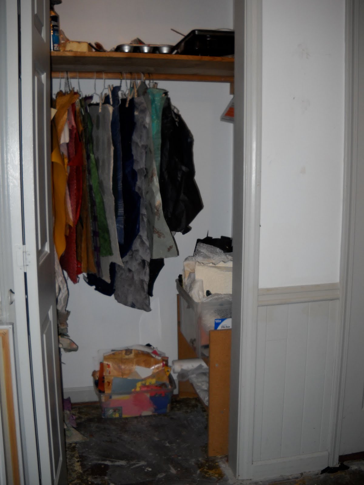 What you see in it is old halloween costumes, wrapping paper and junk, and some nice rice paper hanging up. I decided to make it into a collage paper closet.